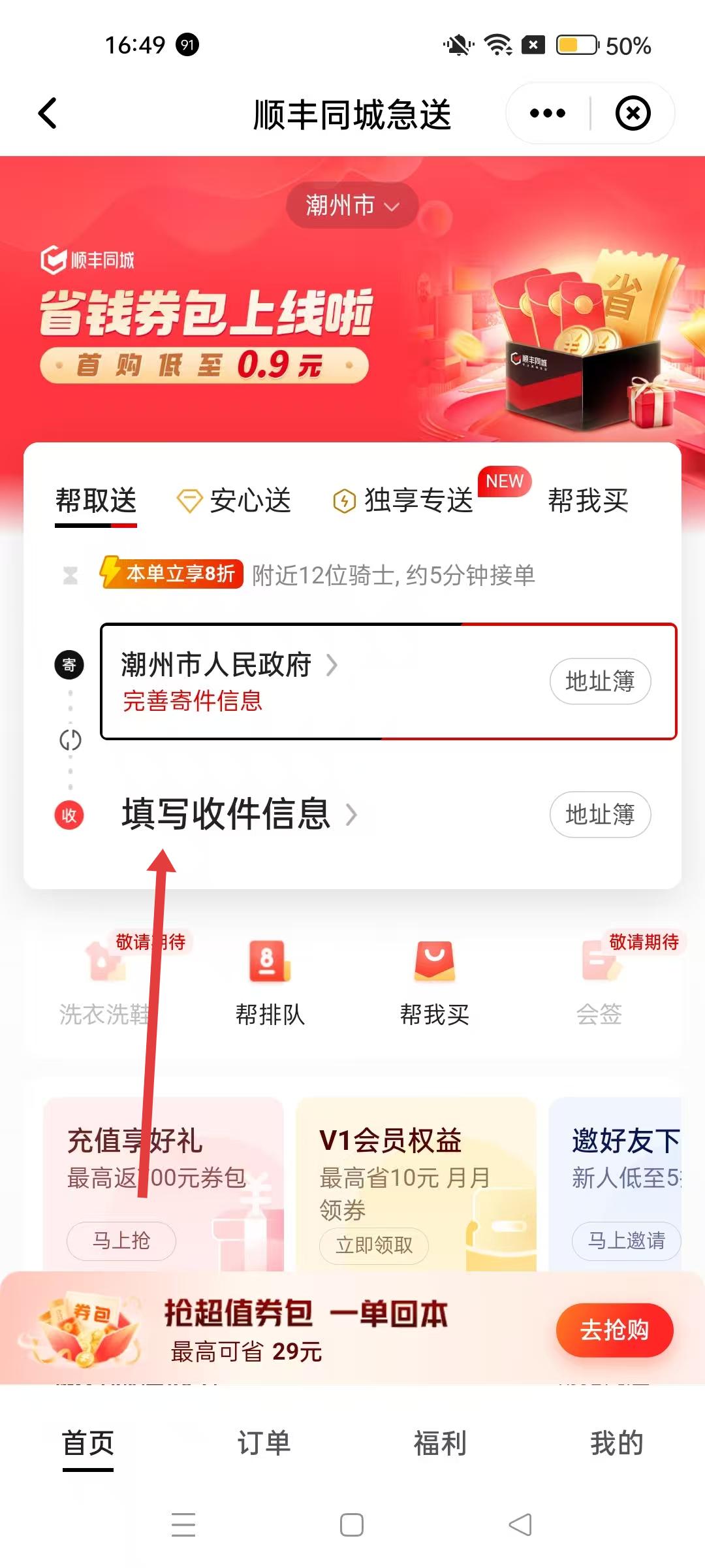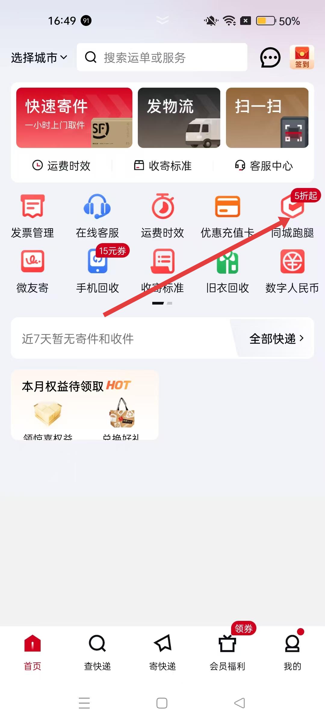 1、順豐APP首頁,點擊同城跑腿,進入同城急送服務(wù)界面,可享受幫取送、幫我買等同城服務(wù)。