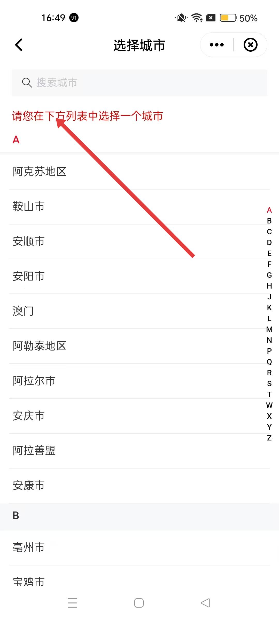 2、選擇城市界面,可從列表中選擇所在城市,以便獲取對應(yīng)的同城急送服務(wù)。