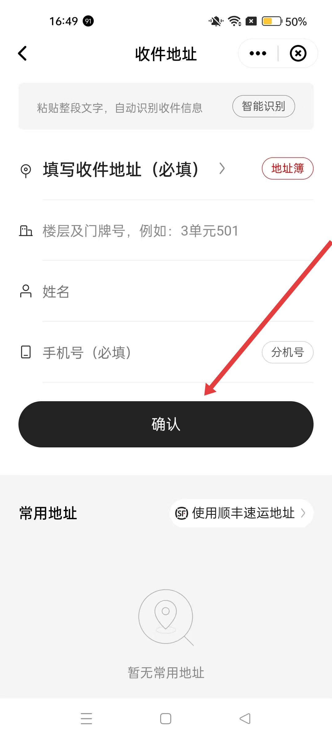4、收件地址界面,填寫收件地址、姓名、手機號等信息后,點擊確認,即可完成收件信息的提交,推進同城急送訂單流程。
