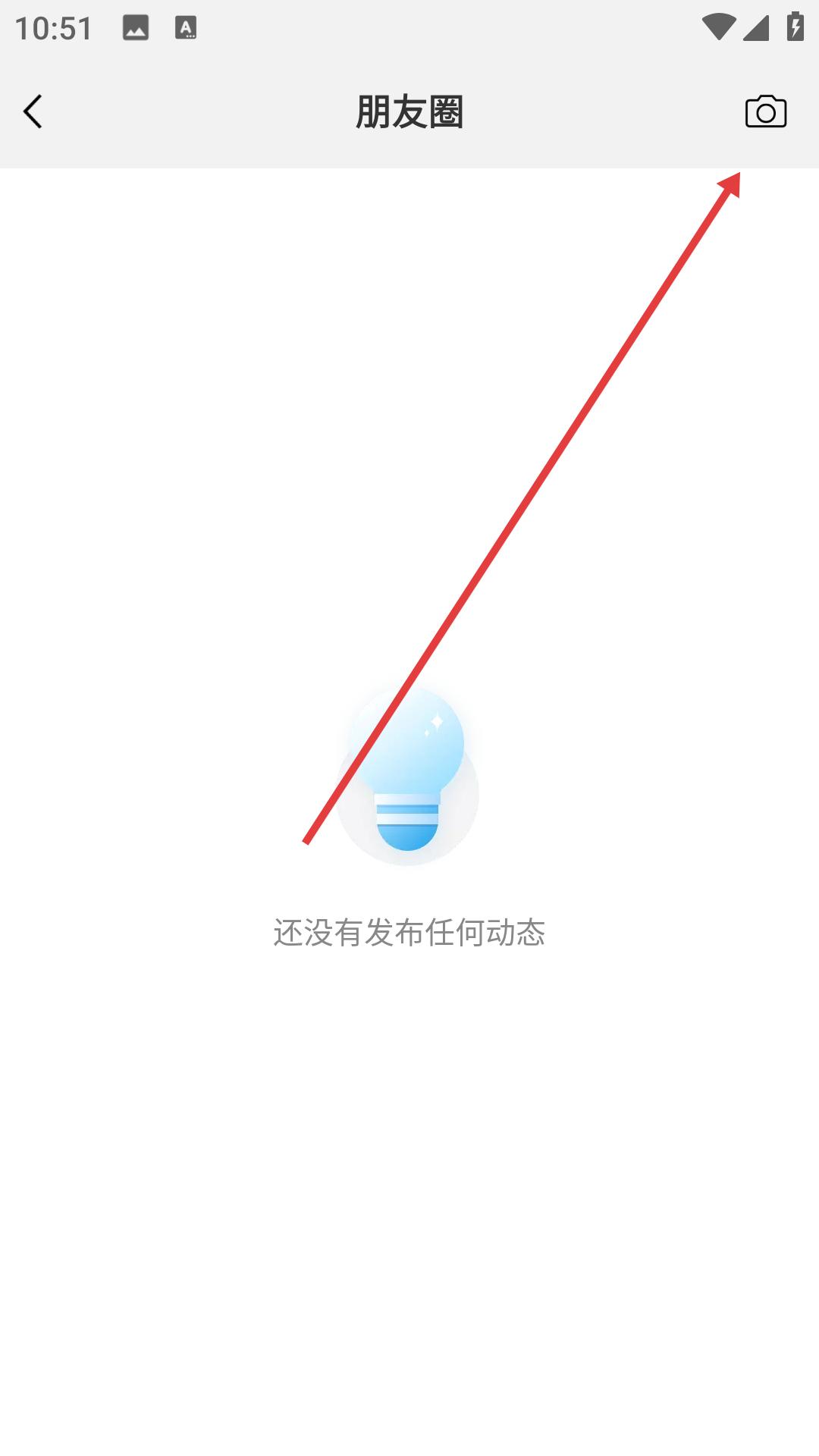 4、進(jìn)入朋友圈頁面,看到右上角的相機(jī)圖標(biāo),點(diǎn)擊該圖標(biāo),準(zhǔn)備發(fā)布朋友圈動態(tài)。