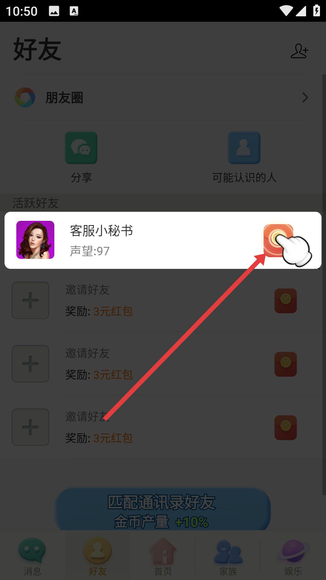 3、在好友邀請相關(guān)頁面,看到客服小秘書的互動標(biāo)識,點(diǎn)擊該標(biāo)識,進(jìn)入與客服小秘書的互動場景。
