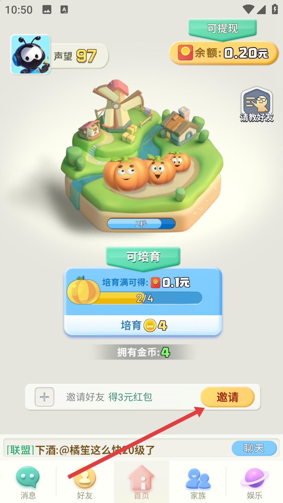 2、培育種子后,看到邀請好友得紅包的提示,點(diǎn)擊邀請按鈕,進(jìn)入好友邀請相關(guān)頁面。