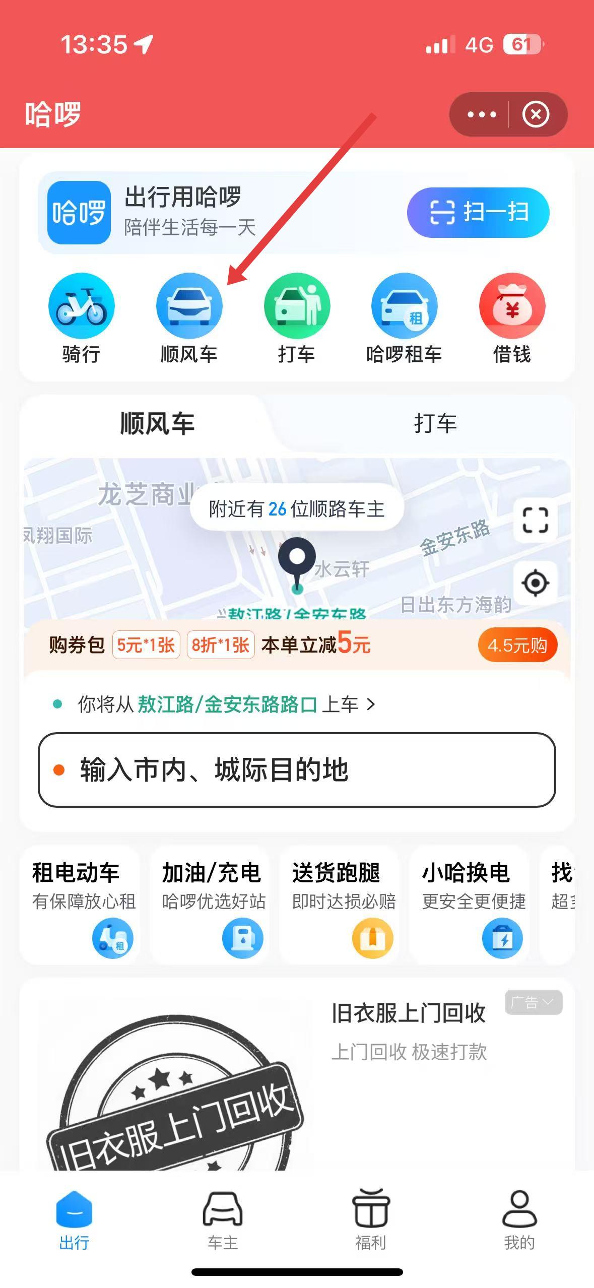 1、主頁面,有騎行、順風(fēng)車等多種出行服務(wù)入口,還有租電動車、加油、充電等功能,點擊順風(fēng)車進入。