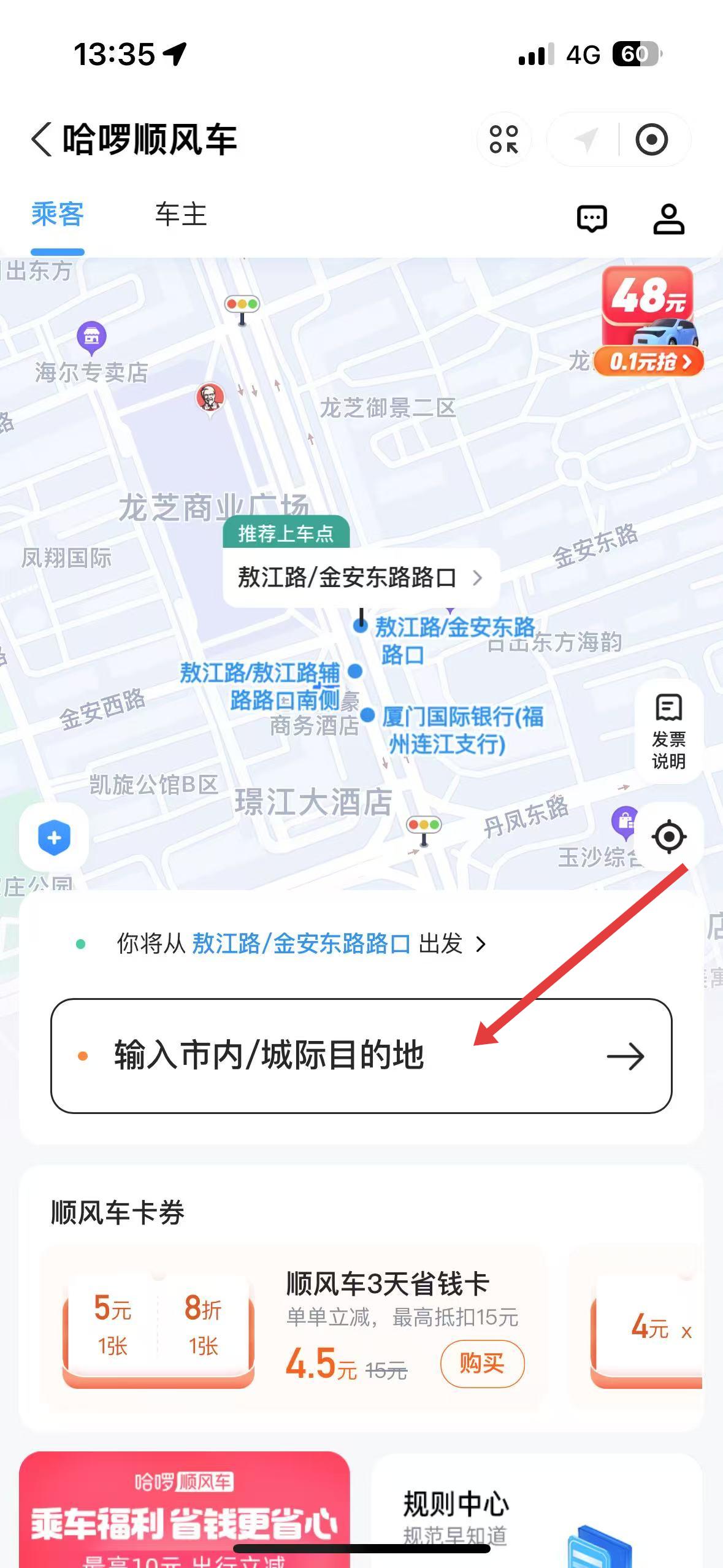 2、順風(fēng)車APP的頁面,用戶可選擇乘客或車主身份,輸入目的地查找順風(fēng)車,還有順風(fēng)車卡券等優(yōu)惠信息。