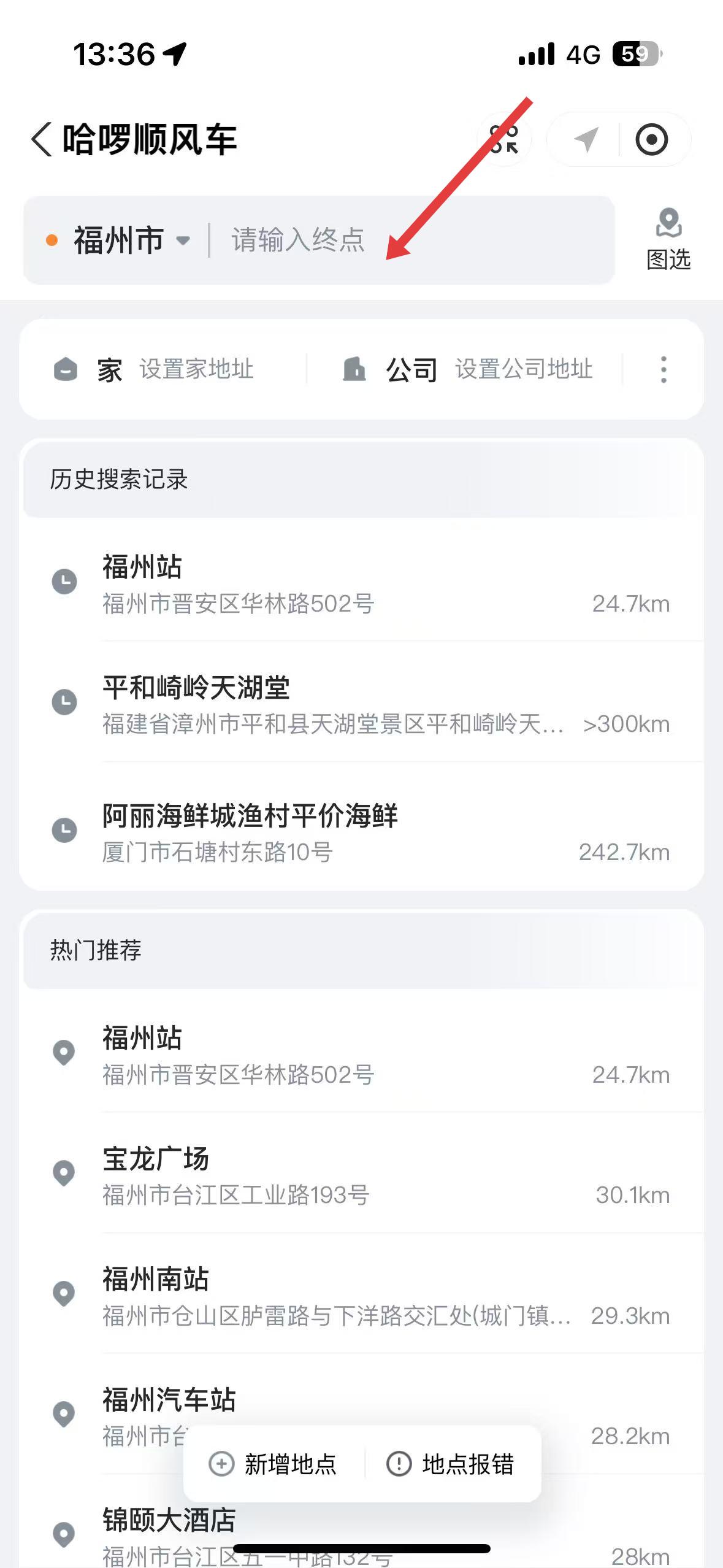 3、目的地輸入頁面,用戶可選擇出發(fā)地為福州市,輸入終點,還有歷史搜索記錄和熱門推薦地點。