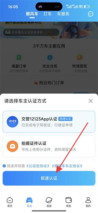 2、在認證方式選擇頁面選擇交管12123App認證或拍攝證件認證,點擊極速認證按鈕,進入微信接單提示頁面。