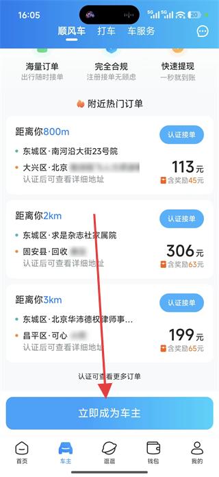 1、進入車主頁面看到附近熱門訂單和立即成為車主的提示,點擊立即成為車主按鈕,進入車主認證方式選擇頁面。