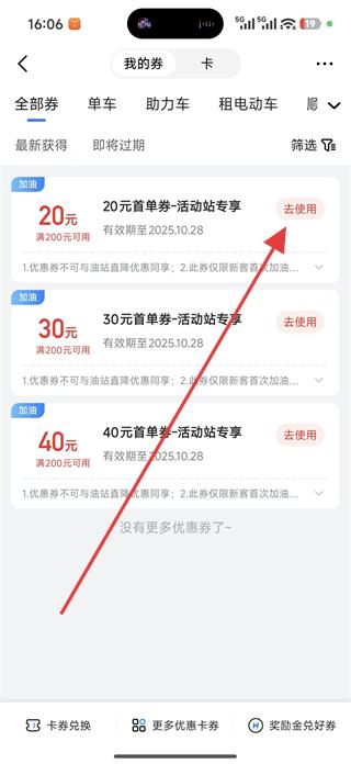 4、認證后進入我的券頁面,選擇20元首單券活動站專享等優(yōu)惠券,點擊去使用按鈕,即可在加油時使用優(yōu)惠券享受優(yōu)惠。