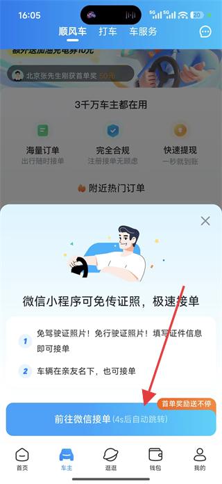 3、在微信接單提示頁面點擊前往微信接單按鈕,完成車主認證流程,后續(xù)可在微信小程序接單。