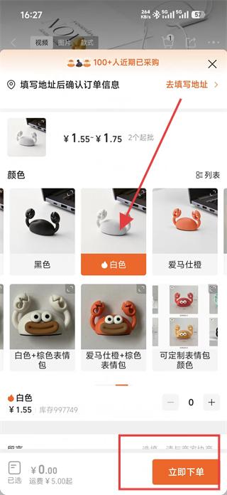 3、確定購(gòu)買(mǎi)選擇商品顏色等規(guī)格,點(diǎn)擊立即下單按鈕,填寫(xiě)地址后完成支付,購(gòu)買(mǎi)該理線器。