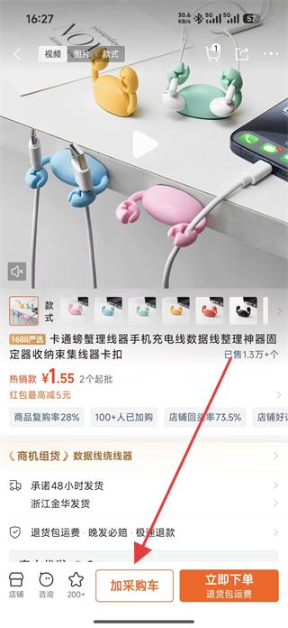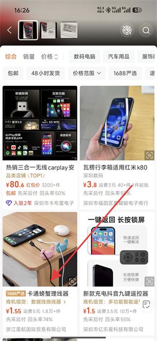 1、打開(kāi)阿里巴巴app,在商品列表頁(yè)找到卡通螃蟹理線器,點(diǎn)擊進(jìn)入商品詳情頁(yè)。