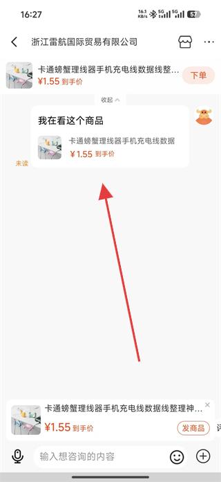 4、若需咨詢(xún)商品信息,可點(diǎn)擊客服按鈕,進(jìn)入與商家的聊天頁(yè)面,發(fā)送商品鏈接詢(xún)問(wèn)詳情。