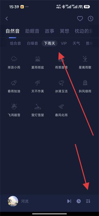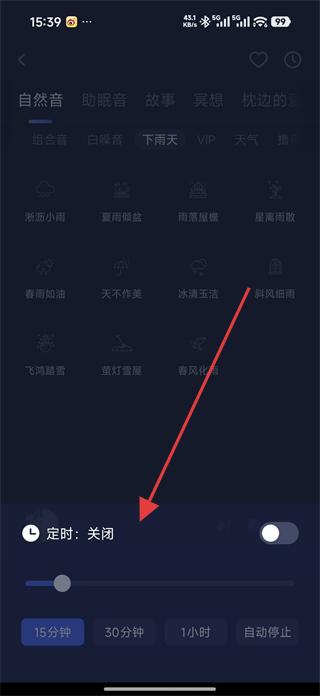 2、在自然音分類頁面選擇下雨天分類,查看淅瀝小雨、夏雨傾盆等多種雨天音效,然后可設(shè)置定時(shí)功能,選擇15分鐘、30分鐘等時(shí)長。