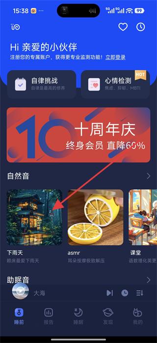 1、瀏覽自律挑戰(zhàn)、心情檢測等功能板塊,選擇自然音中的下雨天選項(xiàng),進(jìn)入自然音分類頁面。