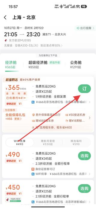 3、進(jìn)入所選航班的詳情頁(yè)面,查看經(jīng)濟(jì)艙、超級(jí)經(jīng)濟(jì)艙、公務(wù)艙等艙位價(jià)格及權(quán)益,點(diǎn)擊預(yù)定進(jìn)入乘客信息填寫頁(yè)面。