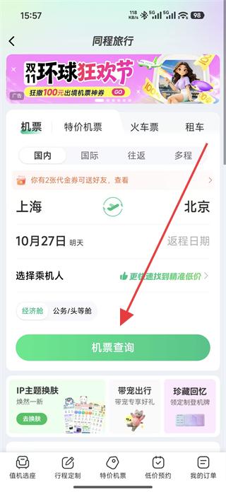 1、同程旅行機(jī)票查詢頁(yè)面,選擇出發(fā)地上海、目的地北京、出發(fā)日期10月27日等信息后,點(diǎn)擊機(jī)票查詢,進(jìn)入航班列表頁(yè)面。