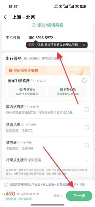 4、在乘客信息填寫頁(yè)面,添加或編輯乘客手機(jī)號(hào)碼,選擇出行服務(wù)等附加選項(xiàng),勾選同意協(xié)議后,點(diǎn)擊下一步,繼續(xù)完成機(jī)票預(yù)訂操作。