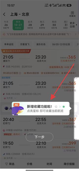 2、在航班列表頁(yè)面瀏覽多個(gè)航班的起飛時(shí)間、到達(dá)時(shí)間、價(jià)格等信息,了解新增收藏功能的提示后,選擇心儀的航班。