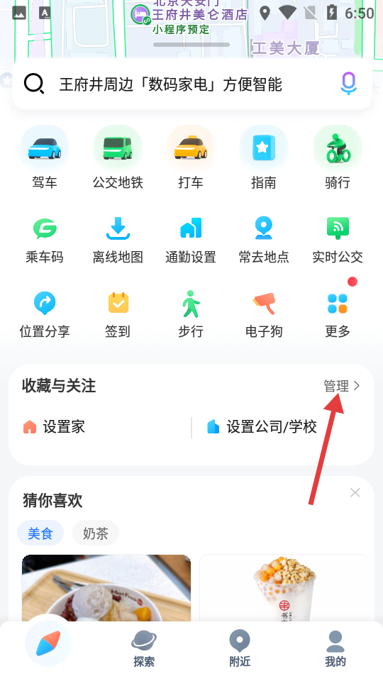 1、打開騰訊地圖進入主界面后,在收藏與關(guān)注板塊點擊管理,進入管理頁面可對家、公司等地點設(shè)置進行管理,為添加店鋪位置做前期準(zhǔn)備,找到地點管理入口。