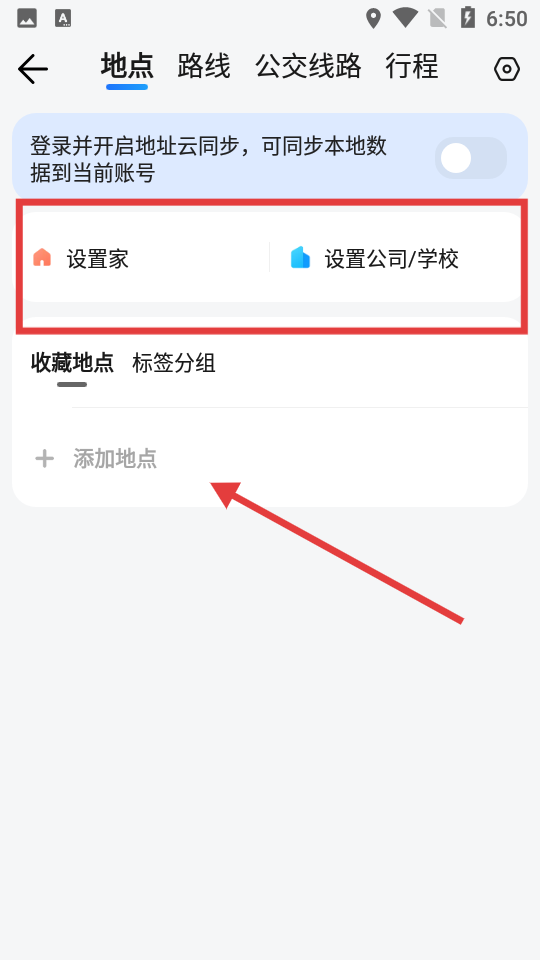 2、在地點管理頁有設(shè)置家、設(shè)置公司學(xué)校選項,點擊添加地點選項進入添加流程,此步是開啟店鋪位置添加的關(guān)鍵操作,讓你能錄入店鋪信息。