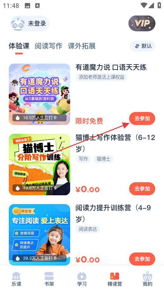 2、精讀營(yíng)頁(yè),列體驗(yàn)課,如有道魔力說口語(yǔ)天天練限時(shí)免費(fèi),點(diǎn)去參加可報(bào)名,豐富閱讀寫作等課外拓展學(xué)習(xí)。
