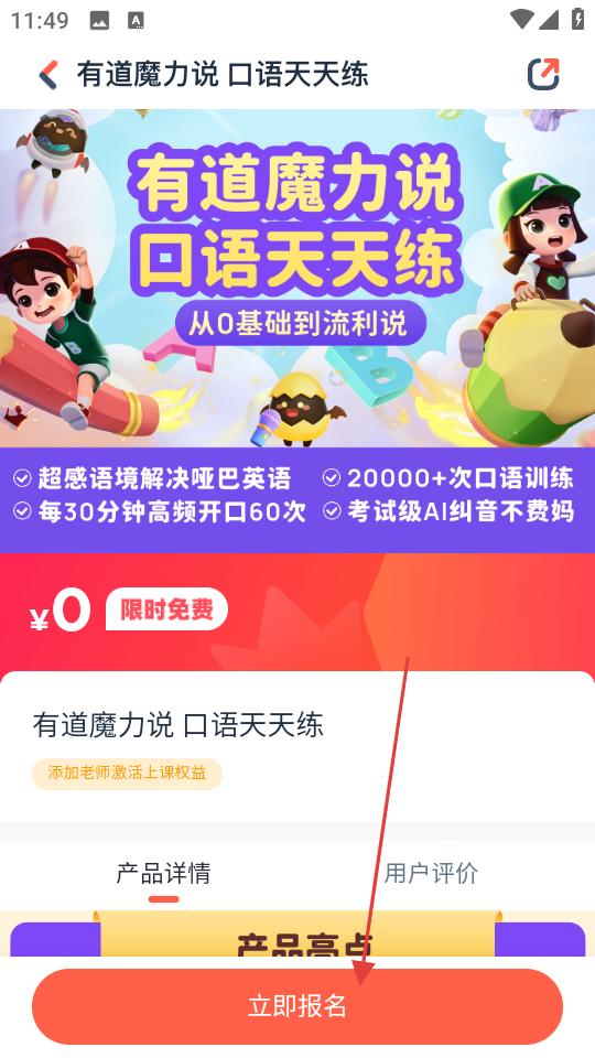 3、有道魔力說口語(yǔ)天天練詳情頁(yè),介紹課程亮點(diǎn),設(shè)立即報(bào)名按鈕,添加老師可激活上課權(quán)益,助力口語(yǔ)學(xué)習(xí)。