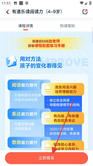 4、在課程詳情頁(yè)面可查看閱讀能力、表達(dá)能力、思維能力提升的課程優(yōu)勢(shì),點(diǎn)擊立即報(bào)名按鈕,參與閱讀力訓(xùn)練營(yíng)。