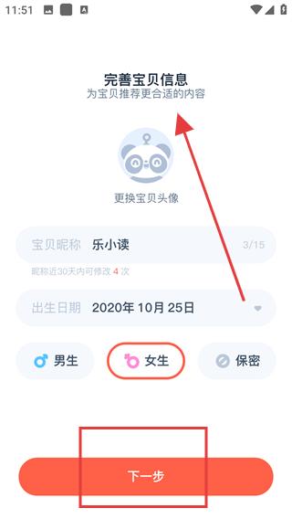 1、打開軟件進(jìn)入完善寶貝信息頁(yè)面,填寫寶貝昵稱、出生日期、性別等信息,點(diǎn)擊下一步按鈕,完成寶貝信息完善。