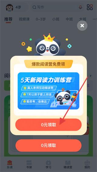 3、在軟件內(nèi)看到爆款閱讀營(yíng)免費(fèi)領(lǐng)的提示,點(diǎn)擊0元領(lǐng)取按鈕,進(jìn)入課程詳情頁(yè)面。