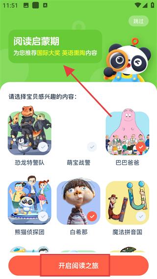 2、進(jìn)入閱讀啟蒙期頁(yè)面可看到為寶貝推薦的國(guó)際大獎(jiǎng)英語(yǔ)熏陶內(nèi)容,選擇寶貝感興趣的內(nèi)容如巴巴爸爸、白希那等,點(diǎn)擊開啟閱讀之旅按鈕。