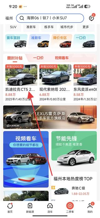 1、進(jìn)入二手車頁面,可看到各類二手車推薦,如凱迪拉克CT5等,點擊進(jìn)入車輛詳情頁。