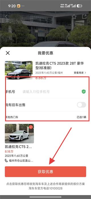 3、在我要優(yōu)惠頁面輸入手機號碼,選擇是否有舊車出售,點擊獲取優(yōu)惠按鈕,即可收到淘車及商家提供的報價方案。
