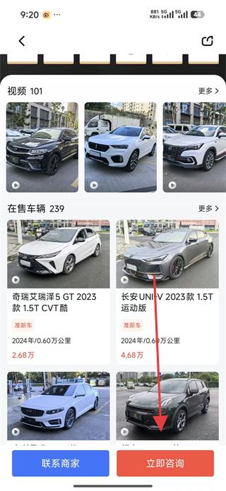 4、若對車輛有疑問可點擊立即咨詢按鈕,與商家溝通,還可查看在售車輛列表,選擇其他心儀車輛進(jìn)行了解。