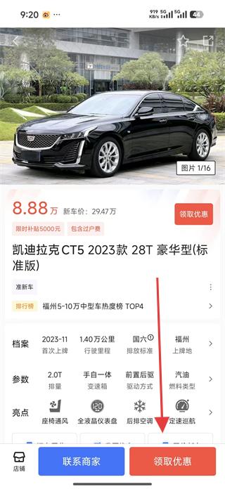 2、在車輛詳情頁可查看車輛價格、檔案、參數(shù)、亮點等信息,若想獲取優(yōu)惠,點擊領(lǐng)取優(yōu)惠按鈕,進(jìn)入我要優(yōu)惠頁面。