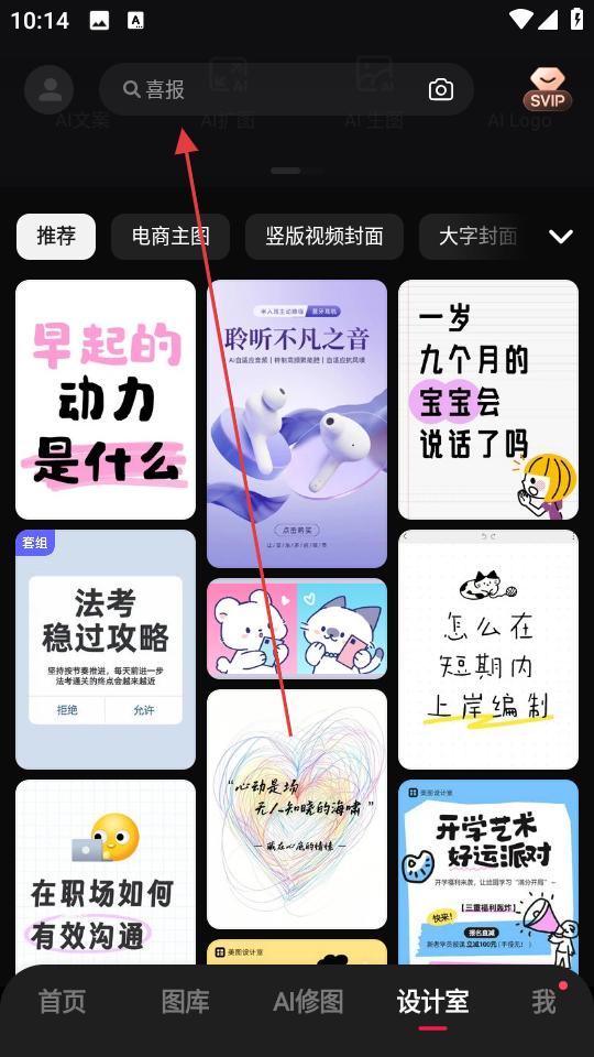 3、切換至設計室頁面,在搜索欄輸入關鍵詞,瀏覽推薦的電商主圖、豎版視頻封面等模板,挑選適用設計素材。