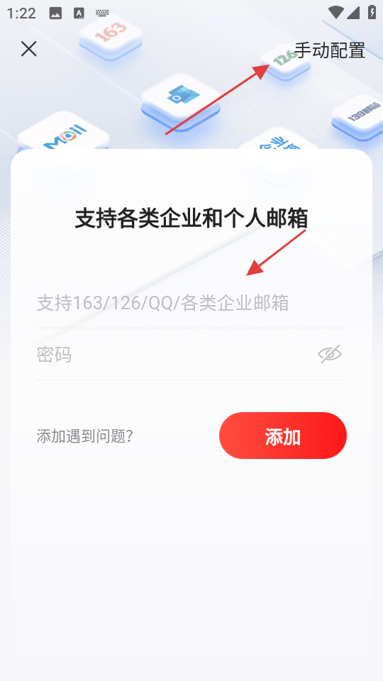 1、郵箱添加界面,用戶可輸入郵箱密碼進(jìn)行添加,方便用戶管理多個(gè)郵箱賬號(hào),點(diǎn)擊右上角的【手動(dòng)配置】。