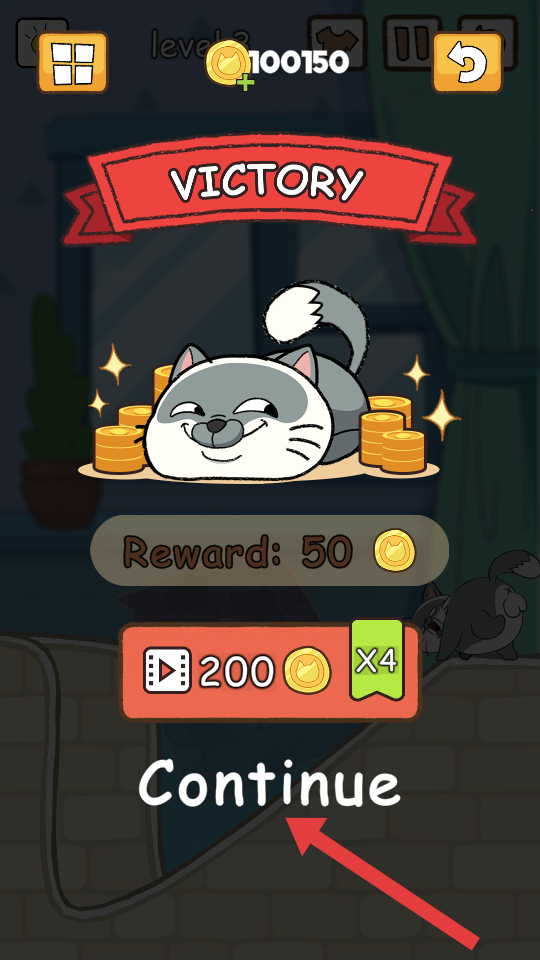 4、成功通關(guān)后,會(huì)出現(xiàn)勝利界面,顯示獎(jiǎng)勵(lì)50金幣,還有觀看視頻得更多金幣的選項(xiàng),點(diǎn)擊Continue可繼續(xù)下一關(guān)游戲。