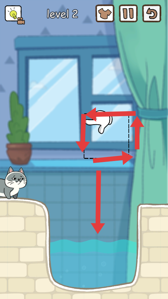 2、到了關(guān)卡2,界面有箭頭提示操作路徑,貓咪在水池邊,需按照箭頭指示的方向和軌跡,通過滑動(dòng)等操作來推進(jìn)游戲進(jìn)程。