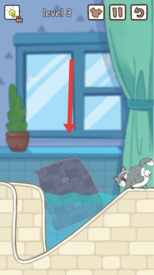 3、在關(guān)卡3界面,場(chǎng)景里有石塊和水池,還有紅色箭頭提示,貓咪在一旁,要根據(jù)箭頭指示,對(duì)石塊等元素進(jìn)行操作,助力貓咪完成關(guān)卡任務(wù)。