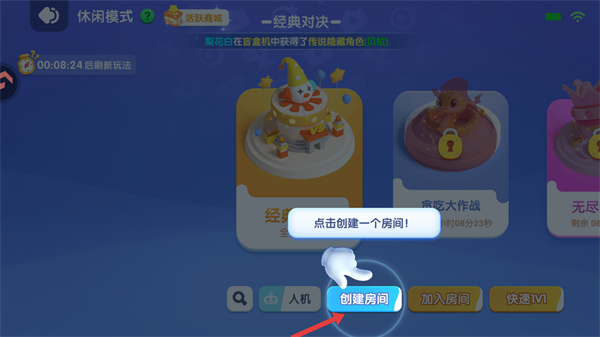 4、進入休閑模式后,可選擇經(jīng)典對決等玩法,點擊創(chuàng)建房間,能創(chuàng)建游戲房間,和其他玩家一起游戲。