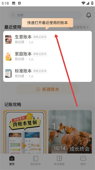 3、進(jìn)入APP主界面看到最近使用的賬本展示,可快速打開最近使用的賬本,方便繼續(xù)記賬操作,也可點擊新建賬本創(chuàng)建新的賬本。