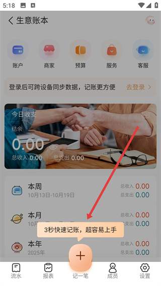 4、進(jìn)入具體的賬本比如生意賬本,看到賬戶、商家等功能入口,以及今日收支、本周、本月等收支統(tǒng)計,點擊記一筆,即可進(jìn)行記賬操作。