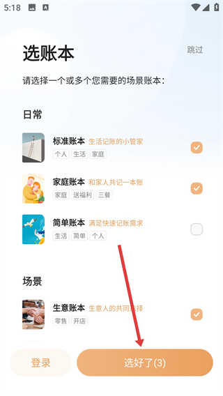 2、在選賬本頁面看到日常、場景等分類下的各類賬本,選擇需要的賬本,比如標(biāo)準(zhǔn)賬本、家庭賬本、生意賬本等,選好后點擊選好了。