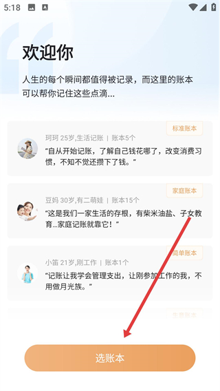 1、打開?隨手記APP,進(jìn)入歡迎你頁面看到不同類型的賬本推薦,點擊選賬本按鈕,進(jìn)入選賬本頁面,準(zhǔn)備選擇需要的場景賬本。