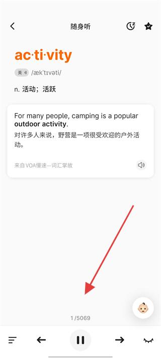 4、開始播放后跟隨單詞的讀音、釋義與例句學習,查看學習進度,隨時暫?;蚯袚Q單詞,全面完成單詞學習軟件的詞庫選擇、播放設(shè)置與聽力學習流程。