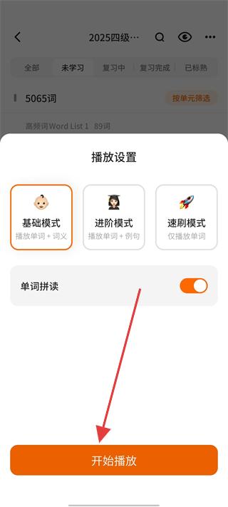 2、在播放設(shè)置頁面選擇基礎(chǔ)模式、進階模式或速刷模式,設(shè)置單詞拼讀功能,點擊開始播放,進入單詞聽力學習流程。