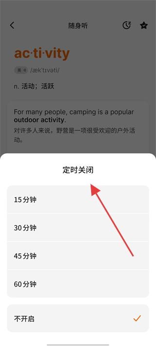 3、在隨身聽頁面設(shè)置定時關(guān)閉時間,如15分鐘、30分鐘等,根據(jù)學習時間安排選擇合適的定時時長,優(yōu)化學習體驗。