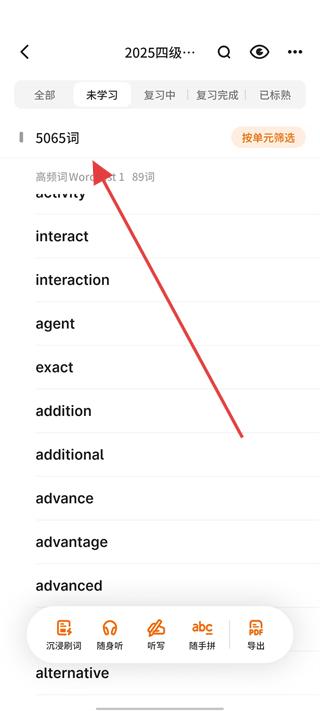 1、進入軟件2025四級詞庫頁面,瀏覽5065詞的高頻詞列表,了解未學習、復習中等單詞分類,選擇隨身聽功能,開啟單詞聽力學習體驗。