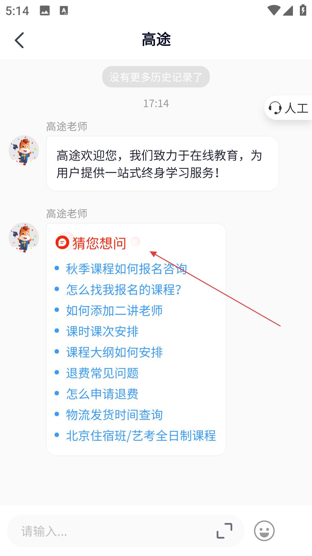 2、進(jìn)入幫助中心相關(guān)界面,看到高途老師發(fā)來的歡迎語,還有猜您想問板塊,羅列著秋季課程報名咨詢、找報名課程等常見問題,選擇想咨詢的問題。