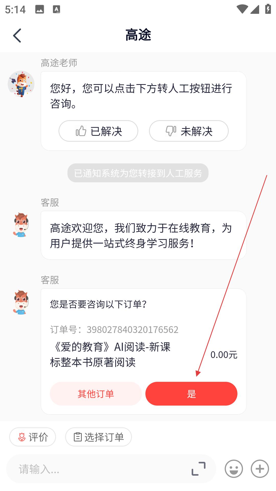 4、提交后客服會發(fā)來消息,詢問是否要咨詢相關(guān)訂單,若有對應(yīng)訂單,點(diǎn)擊是即可進(jìn)一步咨詢該訂單相關(guān)的課程問題。
